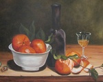 096. Mandarijnen, kom en oude fles.